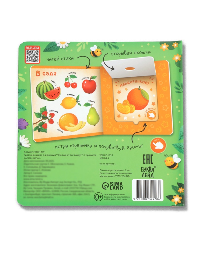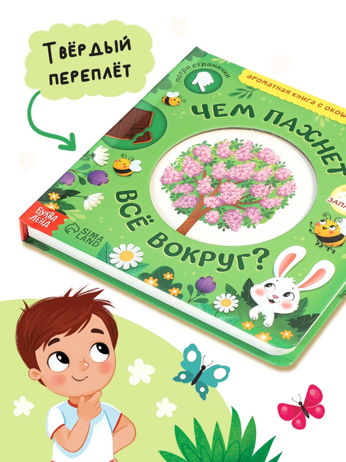 - Безопасна и долговечна. Плотный картон, закруглённые углы, стойкие ароматы — книжка выдержит сотни открытий и «нюханий».