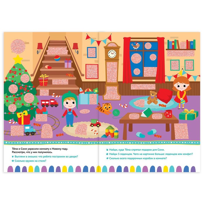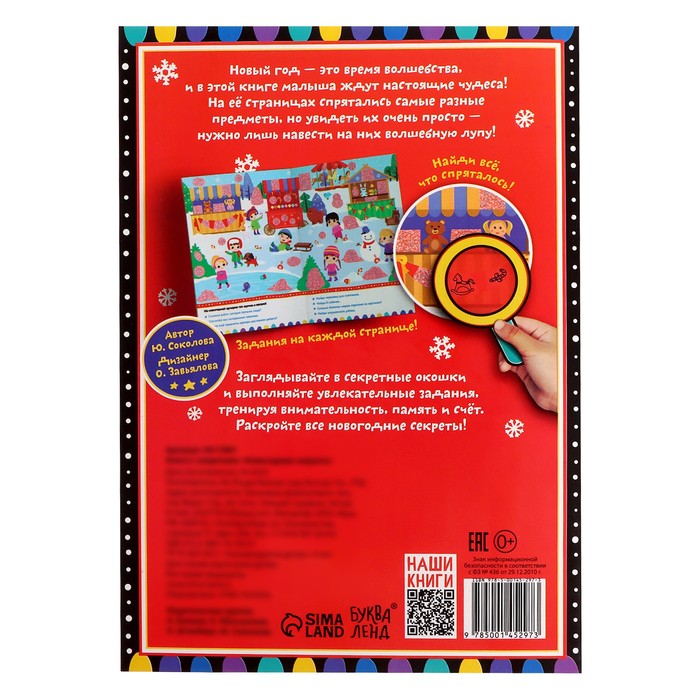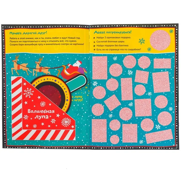 С этой книгой ждать праздника будет интереснее и веселее. Вместе с ребёнком помогите героям подготовиться к Новому году и отыскать всё, что для этого пригодится. А поможет вам волшебная лупа.