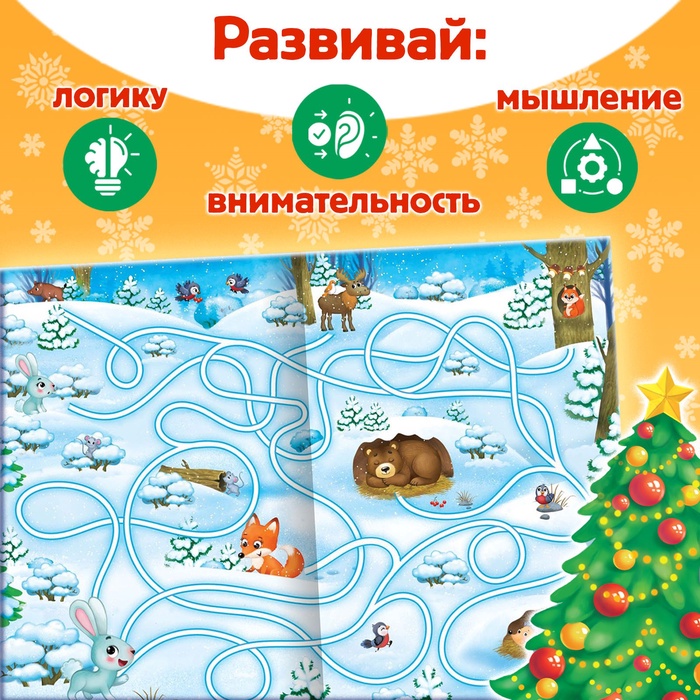 Книга с логическими заданиями «Новогодние игры: Лабиринты» развивает мышление, смекалку, терпение, пространственное воображение, скорость реакции и внимание.