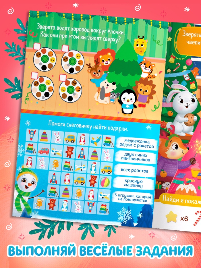 - Игра вместо учёбы. Логика, внимание, счёт — всё спрятано в сюжеты про Деда Мороза, зверят и новогодние хлопоты.