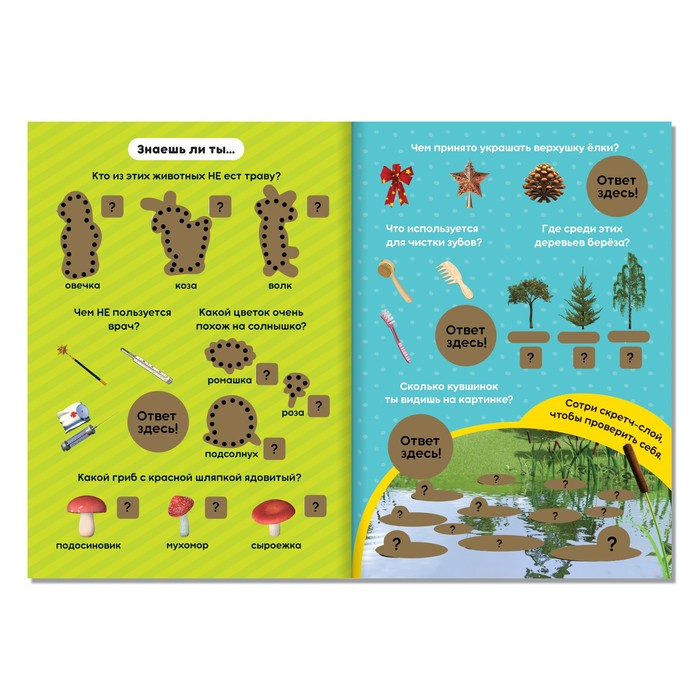 - На каждой странице есть увлекательные задания: на соответствие, логику, внимательность и счёт. Их нужно выполнять, а также искать ответы под скретч-слоем.