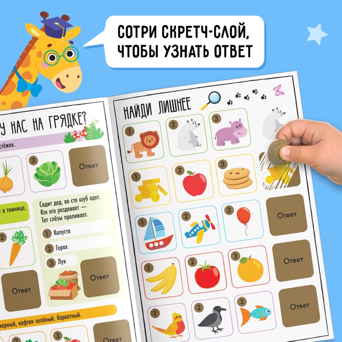 Активити-книга для детей содержит увлекательные задания и волшебные картинки, спрятанные под скретч-слоем. Сотрите его монеткой и узнайте, что внутри!