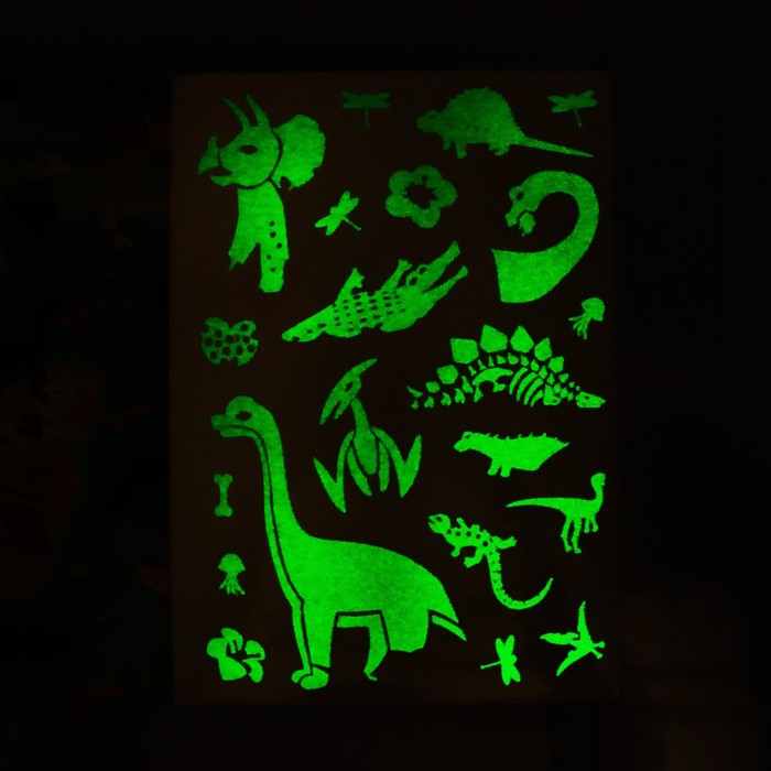 Думаете, динозавры спят по ночам? А вот и нет! Скорее приклеивайте наклейки, выключайте свет и смотрите, как выглядит мир динозавров ночью!