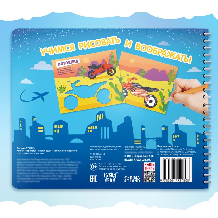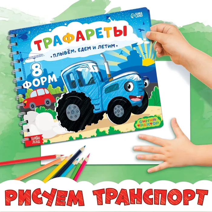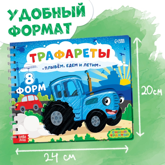 Книга «Трафареты. Плывём, едем и летим», Синий трактор, трафарет в листе книжки — 8 шт., 3+ — Характеристики