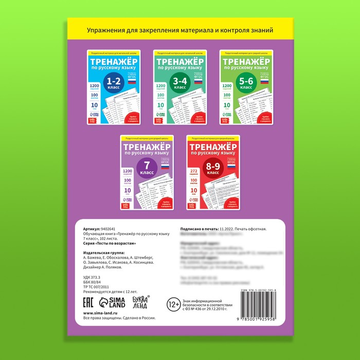 В серии книг-тренажёров по русскому языку «Тесты по возрастам» представлены также книги для 1–2, 3–4, 5–6 и 8–9 классов.