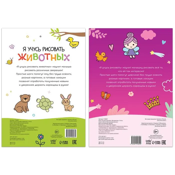 Набор книг для девочек «Я учусь рисовать» формата А4 включает 2 книги по 16 страниц каждая. Эти увлекательные издания помогут ребёнку от 4 лет освоить азы рисования и создать собственные милые рисунки с животными и другими персонажами.
