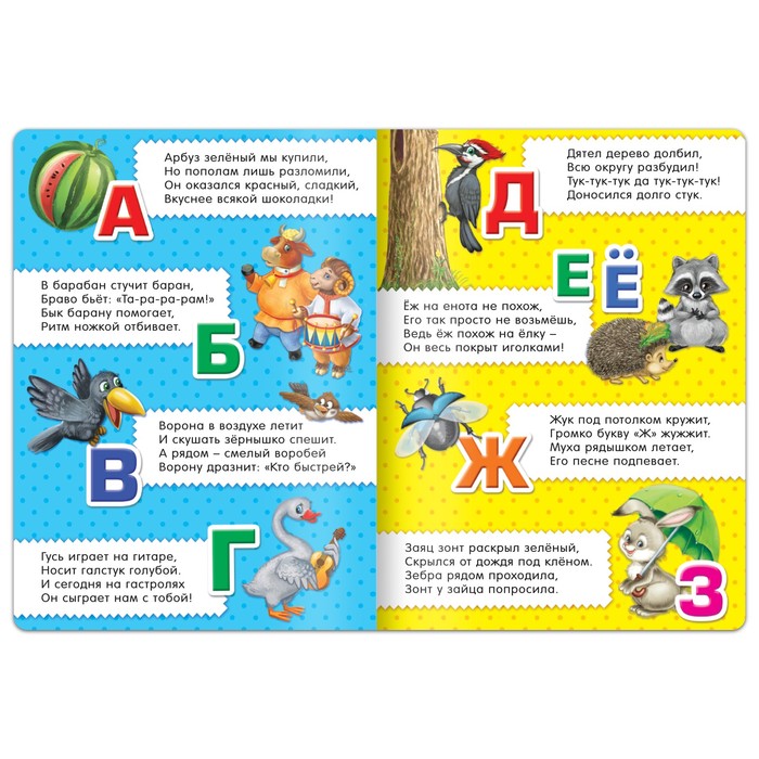 В издании вы найдёте красивые иллюстрации и добрые стихи. Они помогут крохе запомнить все буквы алфавита, выучить цвета и формы и освоить счёт.