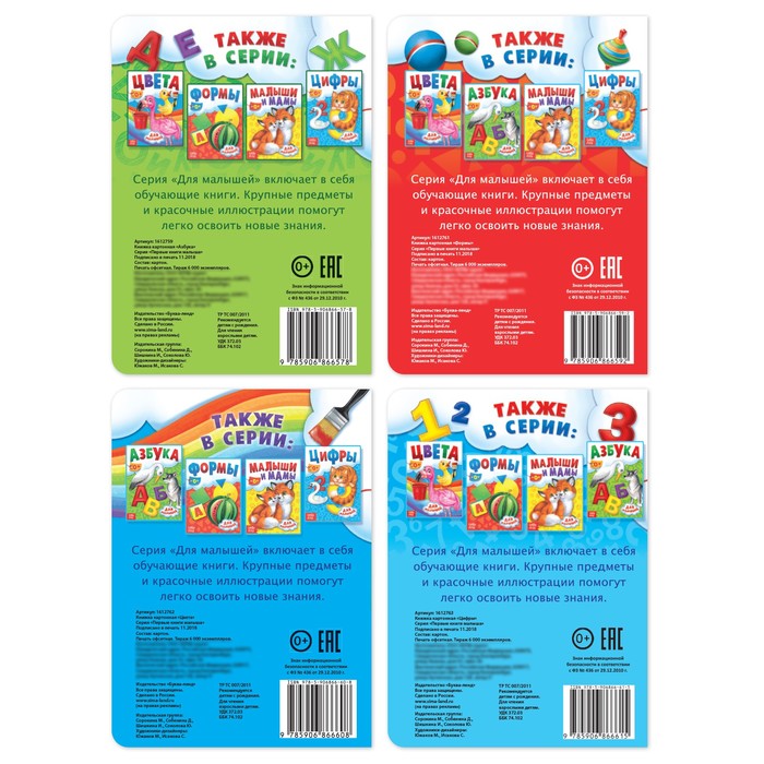 Набор картонных книг включает 4 красочные книги по 10 страниц каждая, которые познакомят малыша с основами: формы, цвета, азбука, цифры и взаимодействие между малышами и мамами. Эти издания с твёрдым переплётом созданы для детей от 1 года и станут идеальным выбором для совместного чтения.
