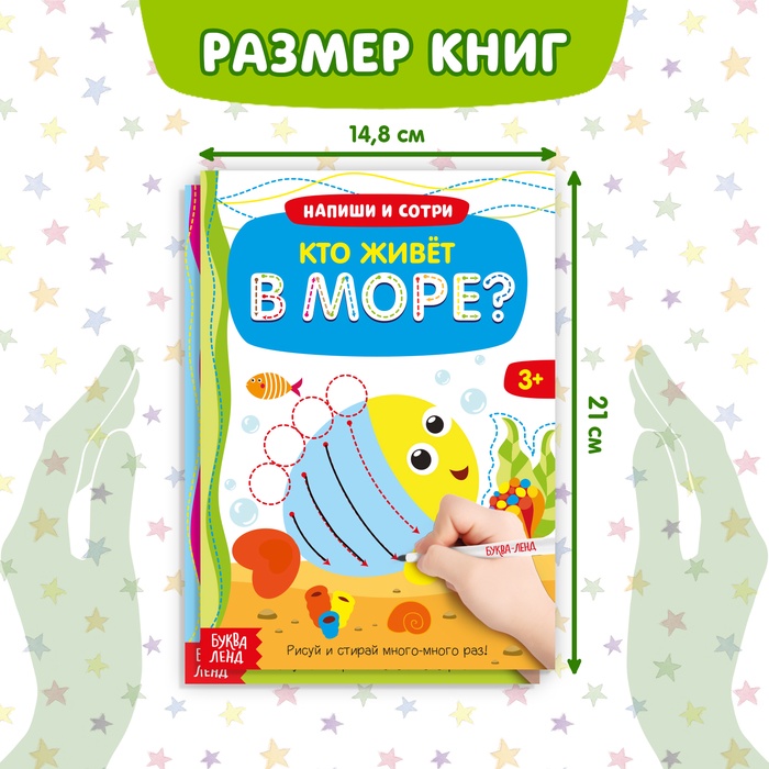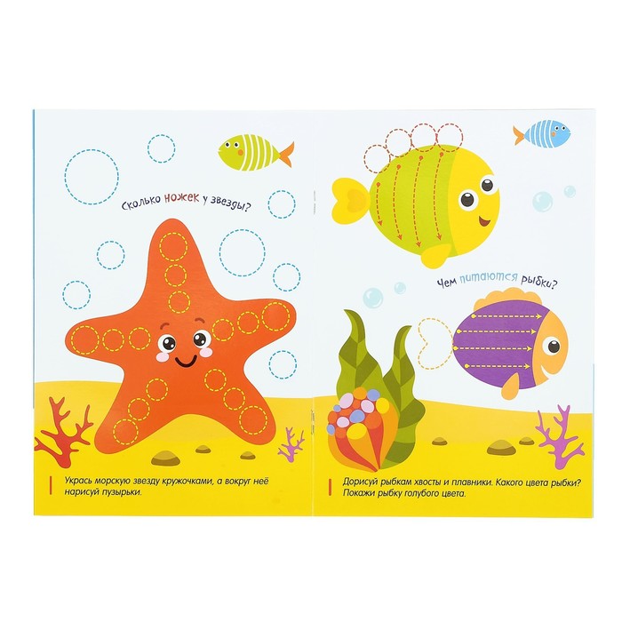 Во время занятий с книгами малыш будет обводить рисунки по пунктирной линии — потренирует моторику и подготовит руку к письму, а также познакомится с морскими обитателями и другими животными.