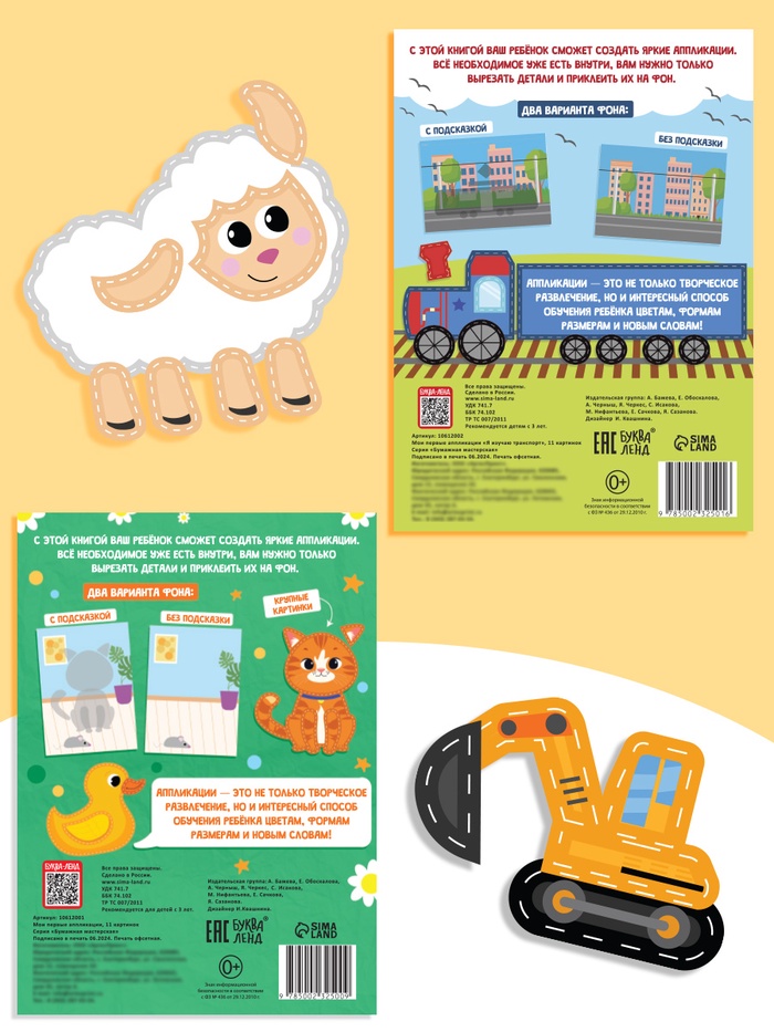 В первой книге представлены аппликации с животными, во второй — с разными видами транспорта.