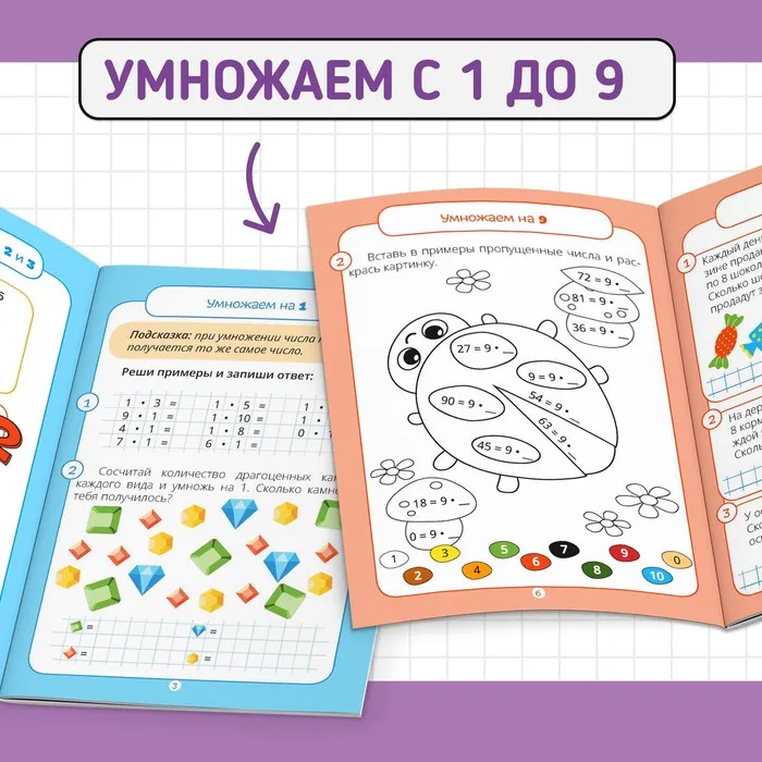 В книгах ребёнок найдёт интересные задания, проверочные задачки и примеры на умножение. Задания преподнесены в игровой форме: такой формат не даст ребёнку заскучать и обучение станет ещё интереснее и желаннее.