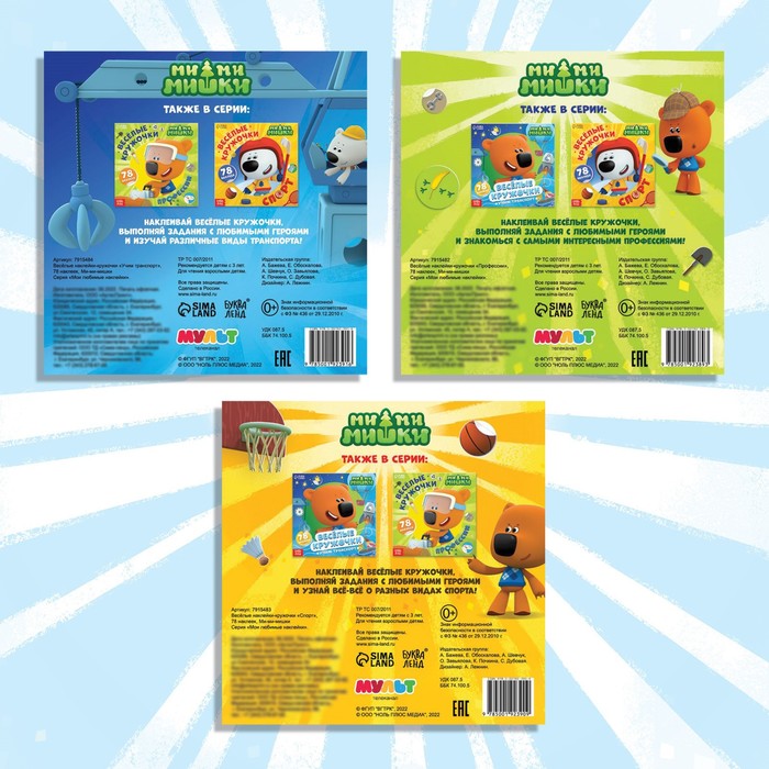 С помощью специальных наклеек-кружочков выполняйте задания и дополняйте ими картинки. А любимые герои «Ми-ми-мишек» не оставят малыша равнодушным и сделают занятия в разы веселее.