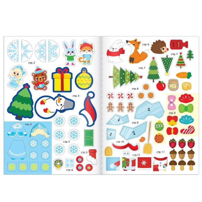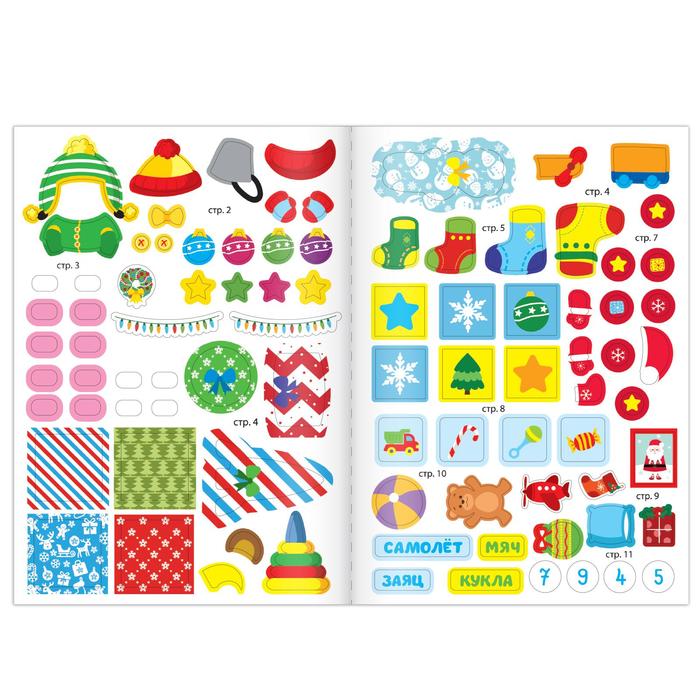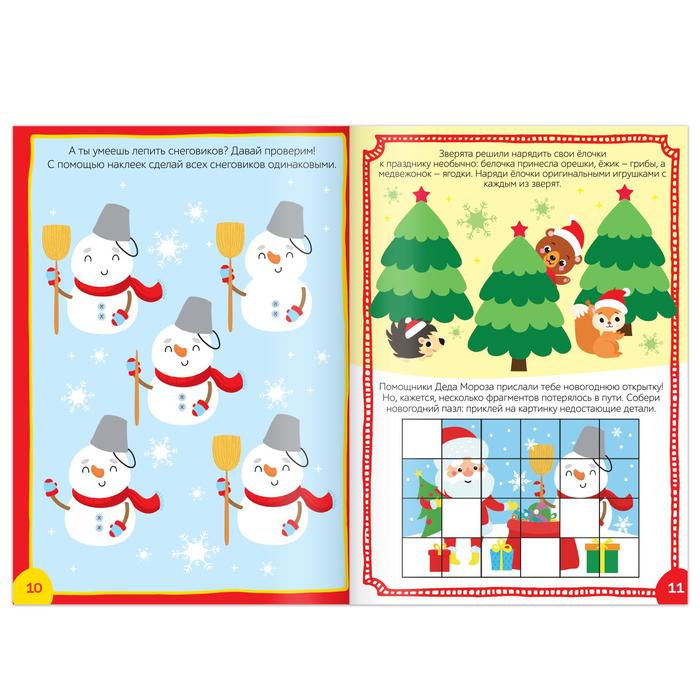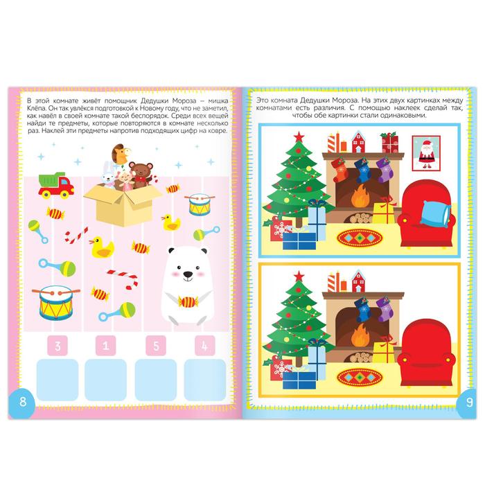 - Внутри ребёнок найдёт интересные задания: ему предстоит наряжать ёлку, одевать Снегурочку и решать много других увлекательных задачек с помощью наклеек.
