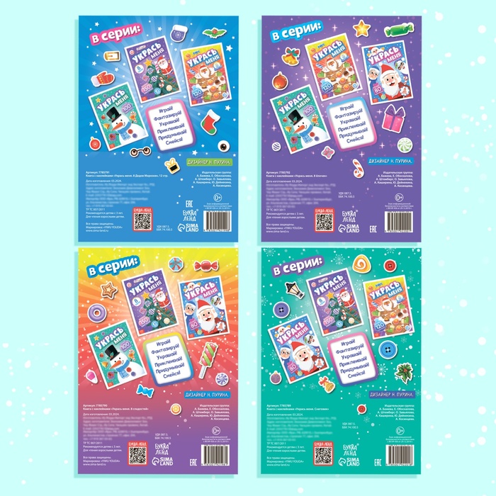 Набор книг с наклейками «Укрась меня» станет замечательным выбором для развлечения и развития детей. Это не просто книги, а увлекательные игры с новогодним настроением, которые помогут малышам создать свои маленькие шедевры. В набор входят четыре книги с мягкой обложкой, каждая из которых наполнена яркими наклейками и заданиями для творчества.