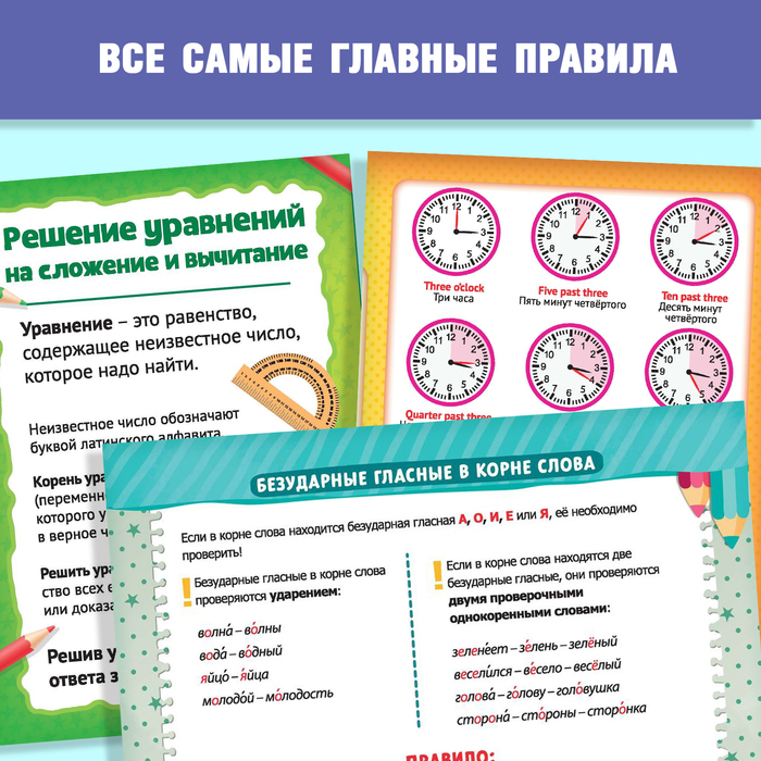 С набором книжек ребёнок закрепит знания, полученные на уроках по русскому, английскому языку и математике. В пособиях в краткой форме изложены основные законы природы. Теория подкреплена простыми и понятными примерами. Пособие станет хорошей памяткой при выполнении домашнего задания и подготовке к контрольным работам.
