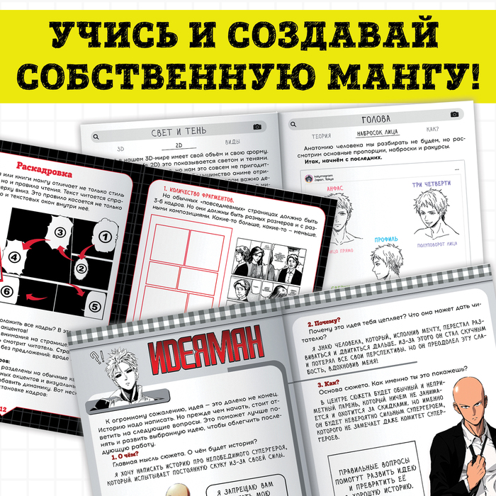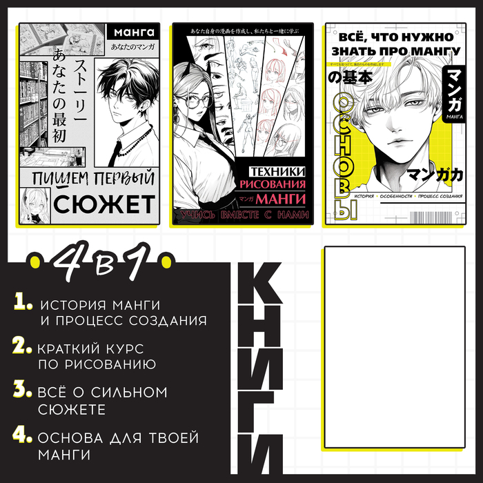 С набором книг вы научитесь рисовать мангу с нуля! В комплекте есть всё необходимое для того, чтобы создать первый томик по собственному сюжету. Из курса вы узнаете историю манги и секреты создания, пройдёте краткий курс по иллюстрированию, узнаете всё о том, как придумать сильный сюжет, а также получите книгу-основу для авторской истории.
