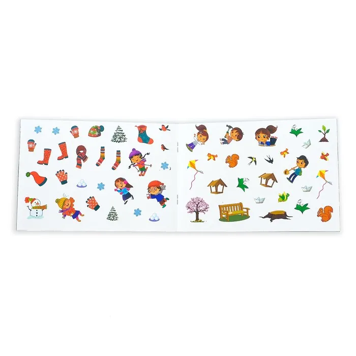 - В альбоме представлено более 100 наклеек с красочными изображениями одежды и атрибутов 4 времён года.