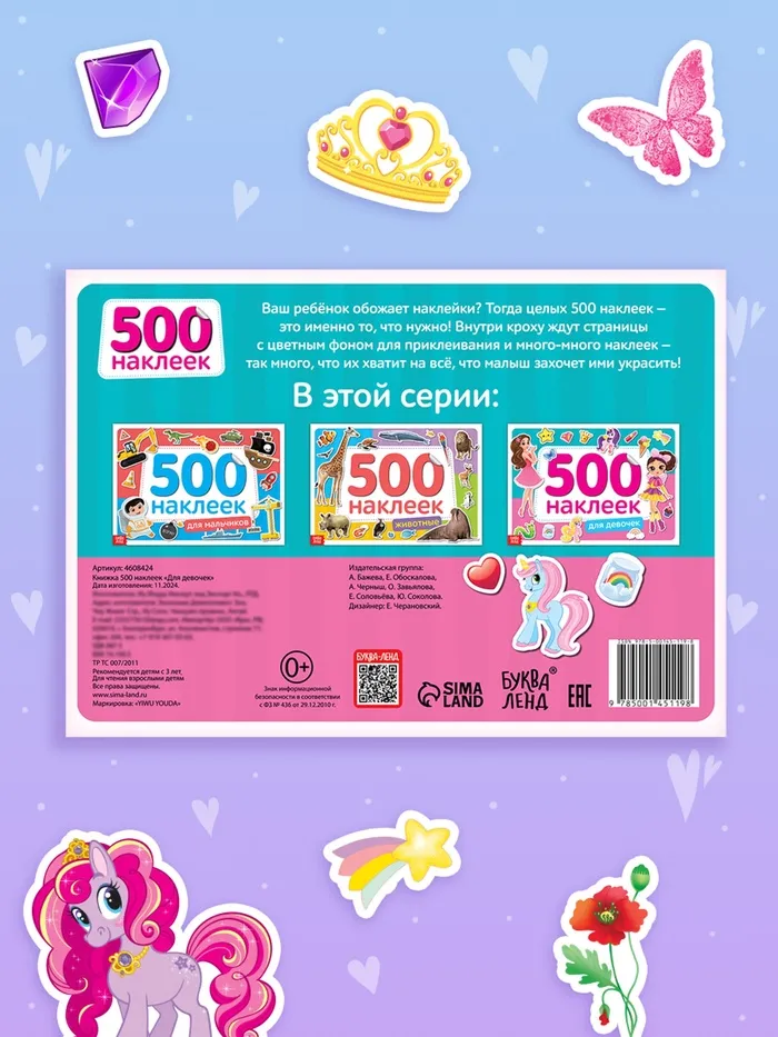 В альбоме представлено 500 наклеек с красочными изображениями. Яркие картинки положительно влияют на визуальное восприятие малыша, память и воображение.
