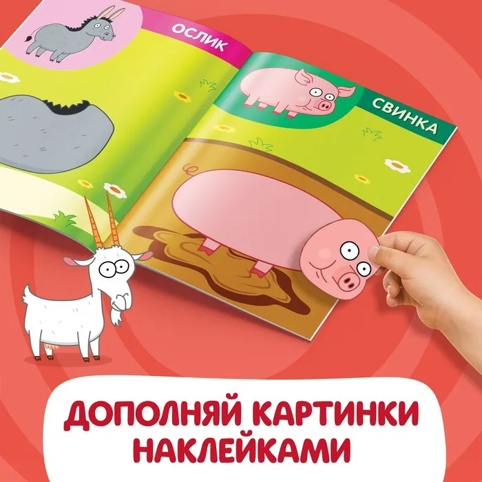 Внимательно посмотрите на образец, найдите подходящие наклейки и соберите весёлые картинки различных животных!