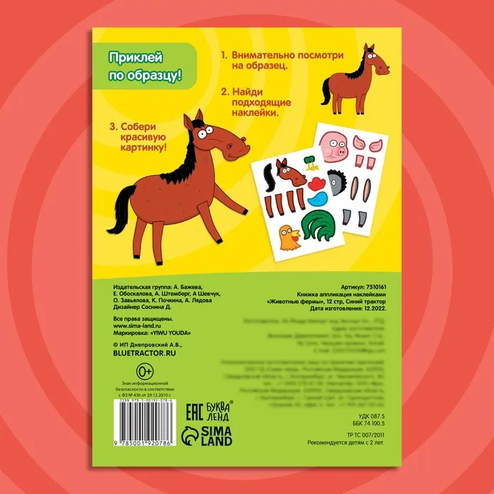 Книжка «Аппликации наклейками. Животные фермы», 12 стр., А5, Синий трактор — Характеристики