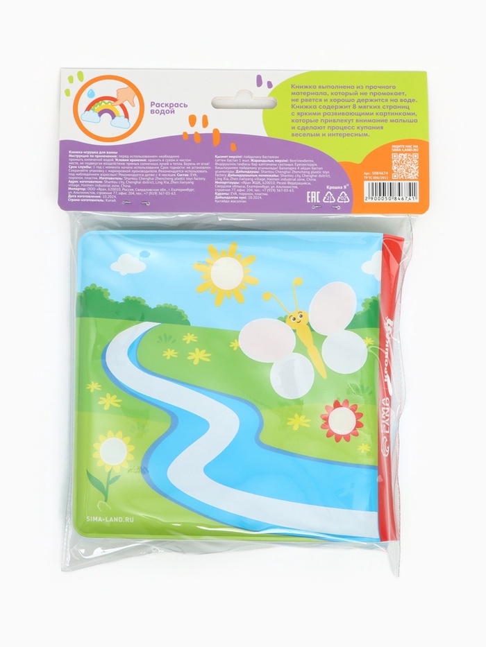 Красивая, яркая книжка предназначена для игры в ванной комнате, малышу будет очень весело разрисовывать книжку пальчиками, от контакта с водой книжка окрашивается разными цветами, после высыхания возвращается в первичное состояние. Изготовлена из безопасных материалов.