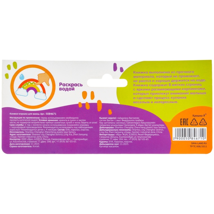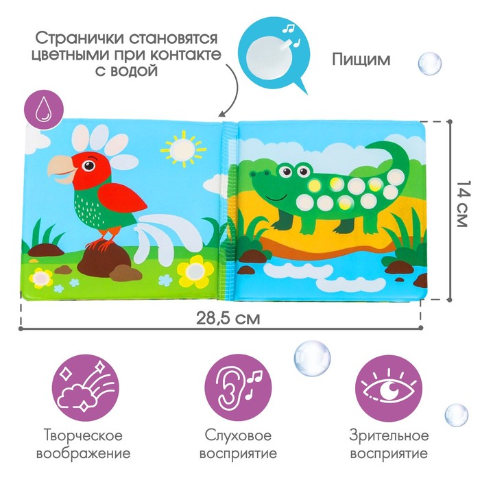 • Книжка выполнена из безопасного материала, который не разрушается под воздействием воды. Она плавает на поверхности, что делает процесс игры комфортным и безопасным для малыша.