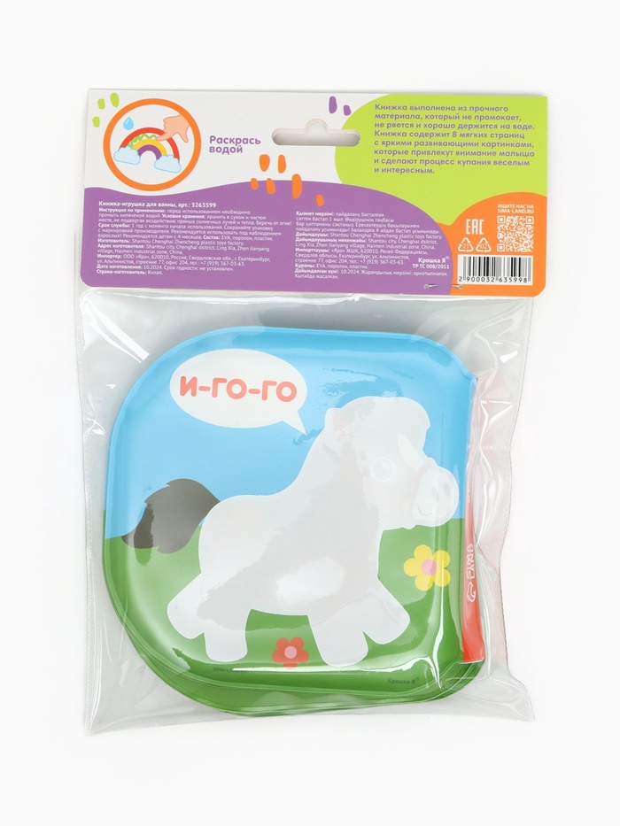 - Книжка выполнена из безопасного материала, который не разрушается под воздействием воды. Она плавает на поверхности, что делает процесс игры комфортным и безопасным для малыша.