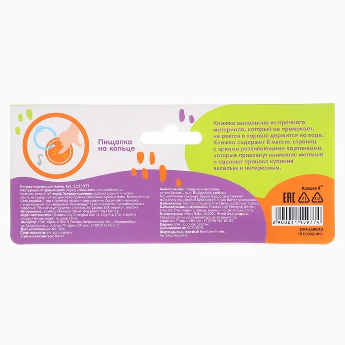 Книжка - игрушка для ванны «Зоопарк», водная раскраска, Крошка Я — Характеристики