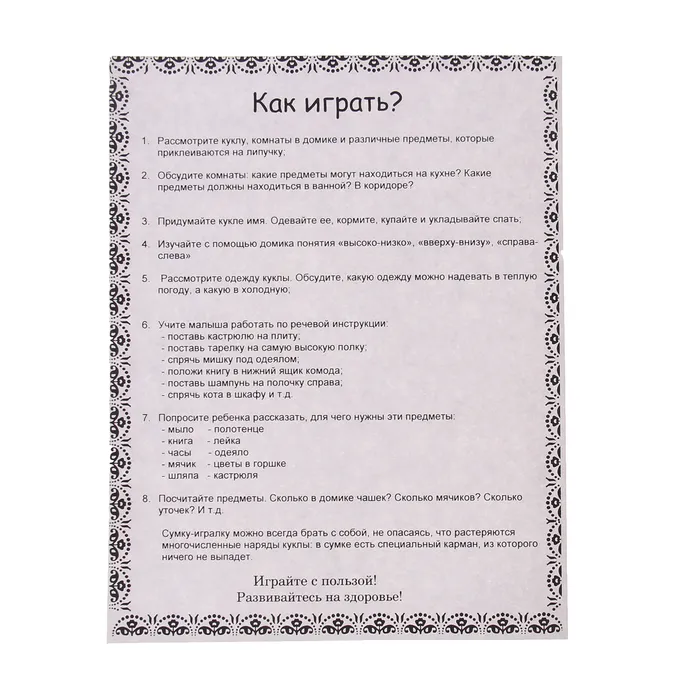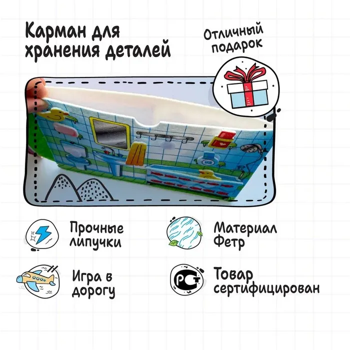 Фетровый игровой набор «Кукольный домик» — это компактный и многофункциональный домик для девочек, который станет идеальным спутником в развивающих играх. В набор входят 38 элементов, включая куклу высотой 11 см, которые легко крепятся на липучках. Домик разделён на 4 комнаты: кухню, спальню, ванную и прихожую со шкафом, что позволяет ребёнку погрузиться в мир ролевых игр и творчества. Удобная сумка-переноска с карманом для аксессуаров делает набор мобильным и практичным для путешествий.