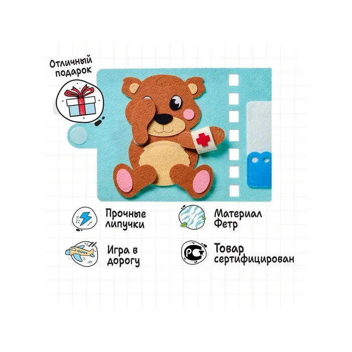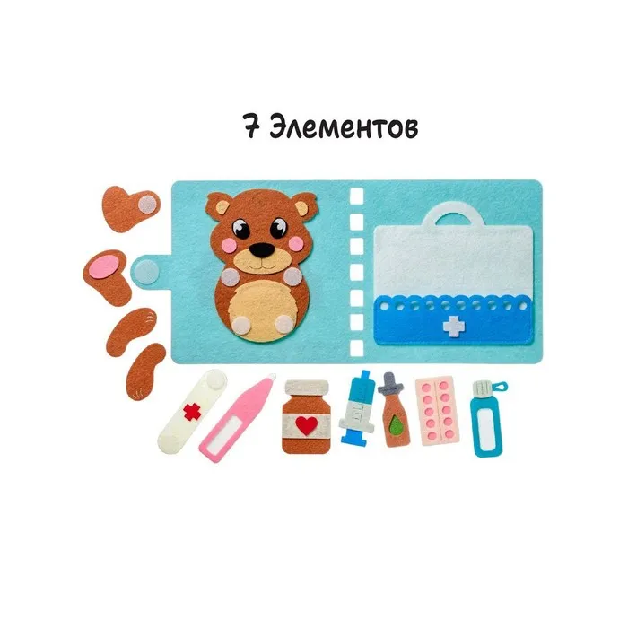 Развивающая книжка «Лечим мишку» — это многофункциональная игрушка для проведения сюжетно-ролевых игр, знакомства с окружающим миром и цветами. Фигурки можно прикрепить к книжке с помощью липучек. Лапки мишки можно откреплять, а лекарства сложить в аптечку. Научите малыша оказанию первой медицинской помощи с помощью этого набора!