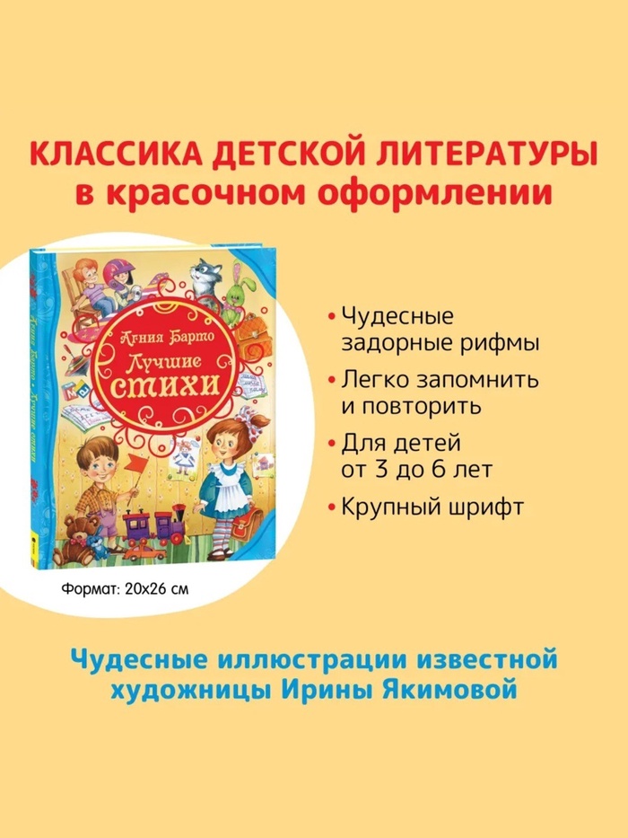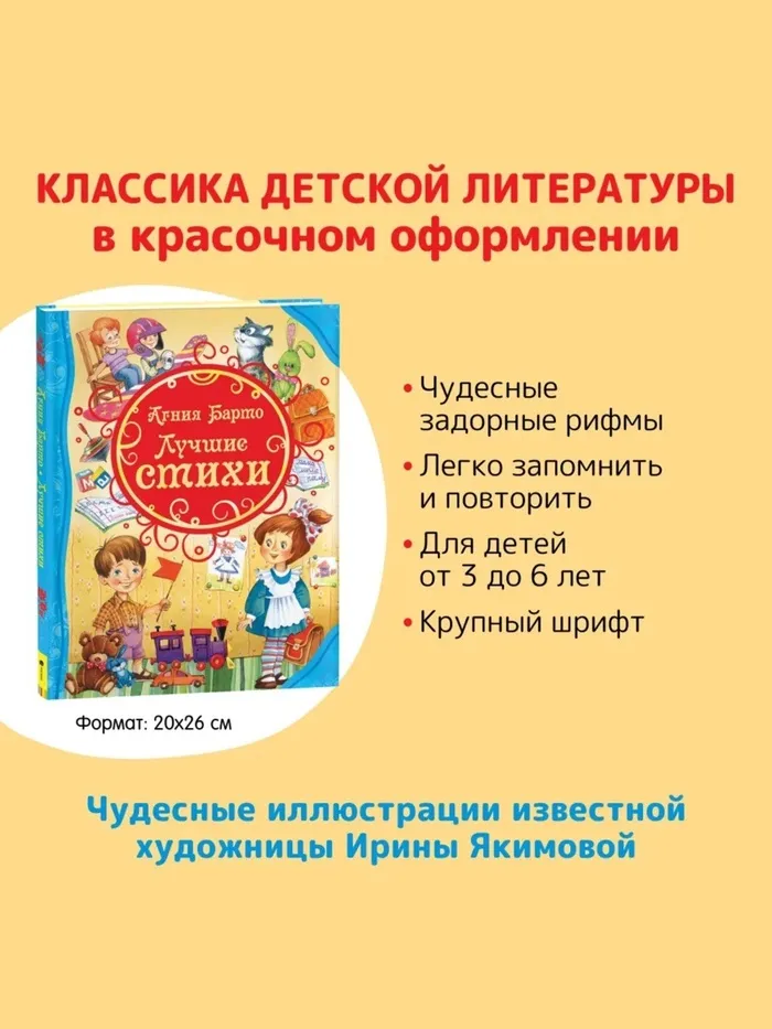 Книга «Лучшие стихи» для детей Агнии Барто — это сборник знакомых с детства строк, которые учат, развлекают и вдохновляют. Яркие иллюстрации Ирины Якимовой оживляют каждое стихотворение, делая чтение ещё более увлекательным для малышей.