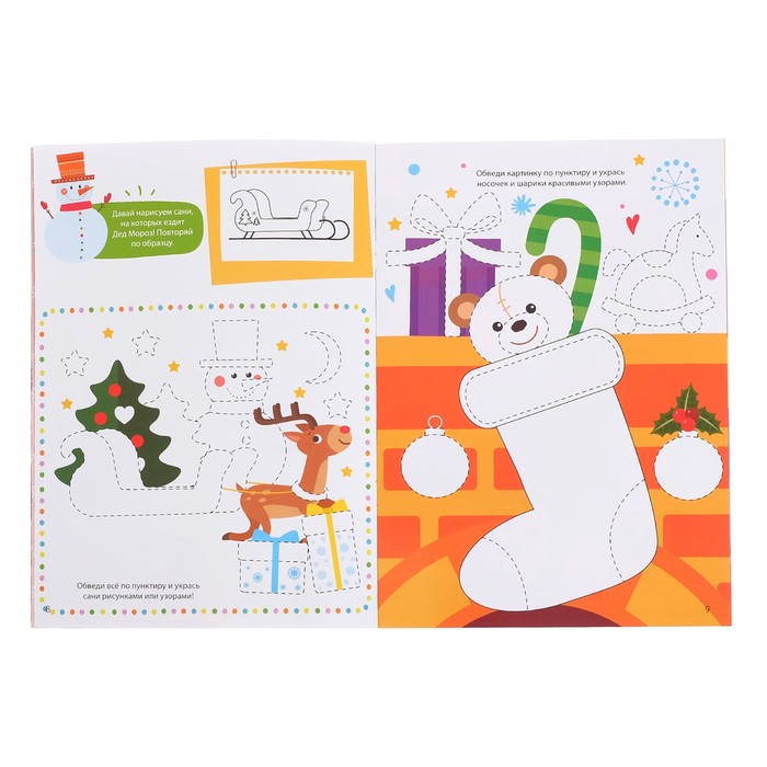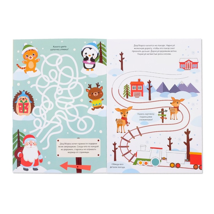 Кроха с удовольствием будет выполнять задания: дорисовывать железную дорогу, проходить лабиринты и помогать Деду Морозу разносить подарки. Такая игра подготовит руку к письму, а также поможет развить логическое мышление.