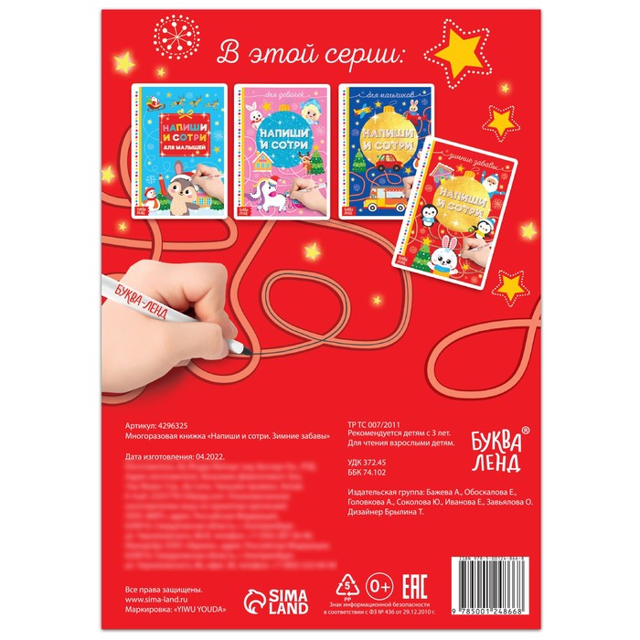 Многоразовая книжка «Пиши-спирай. Зимние забавы» подарят малышу ощущение новогоднего волшебства. Особенность изданий — глянцевые страницы. Маркер с них стирается, а значит заниматься с книжкой можно не один раз.