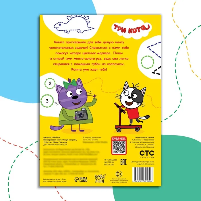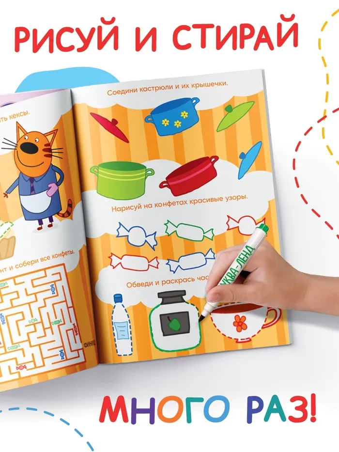 Книжка многоразовая «Рисуй и играй», 17×24 см., 20 стр., с маркерами, Три кота — Характеристики