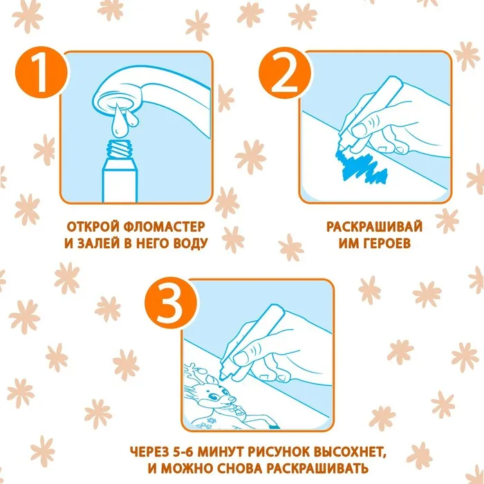 - Через 5–6 минут вода высохнет, и картинку можно снова раскрашивать.