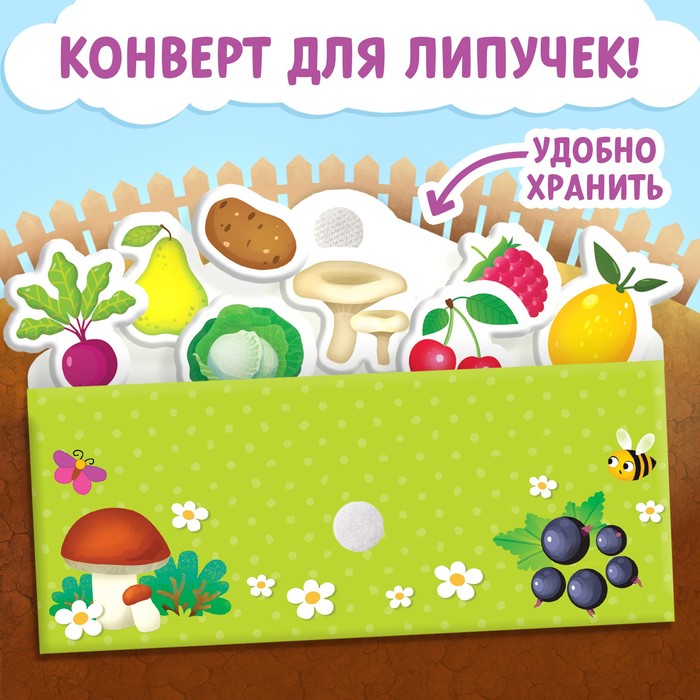 - Мягкие липучки клеятся в книгу, а твёрдые — на фрукты и овощи.
