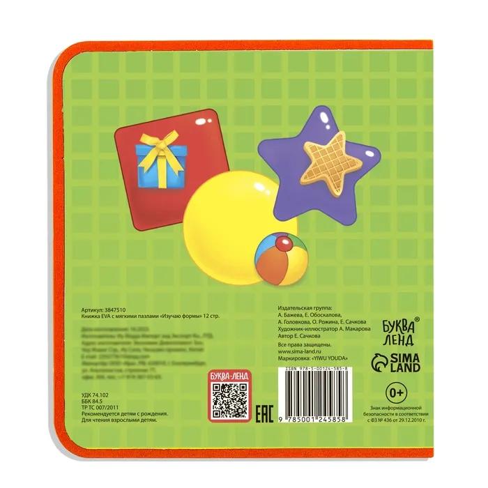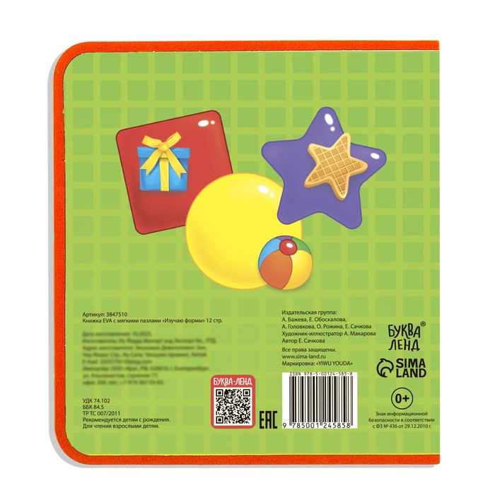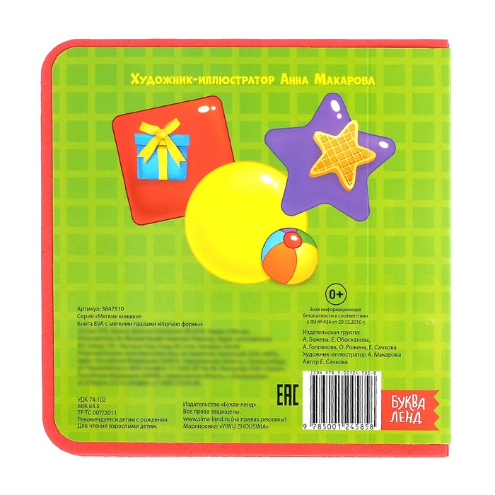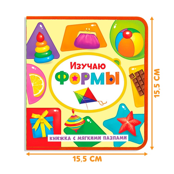 Мягкая книга сделана из приятного на ощупь пористого материала ЭВА. На каждой странице приклеены яркие иллюстрации с разными геометрическими фигурами, которые понравятся малышу.