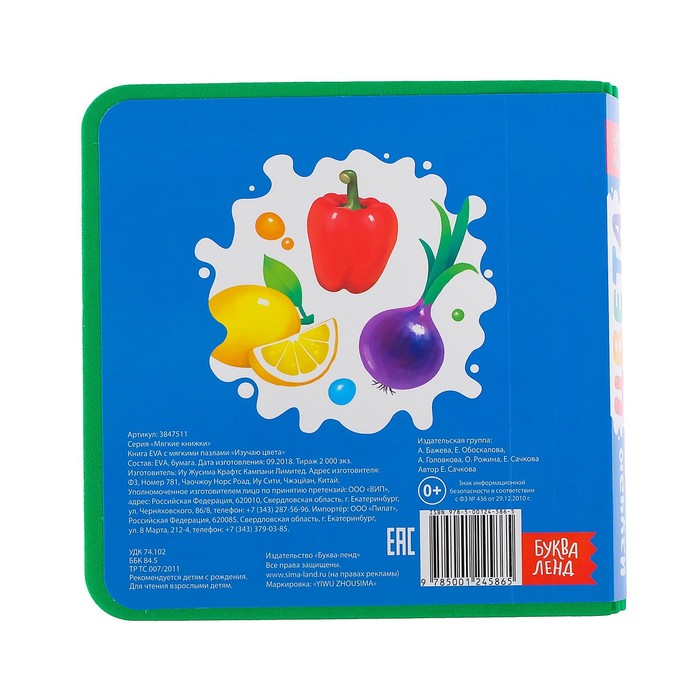 Мягкая книга сделана из приятного на ощупь пористого материала ЭВА. На каждой странице приклеены яркие иллюстрации с предметами и животными разных цветов, которые понравятся малышу.