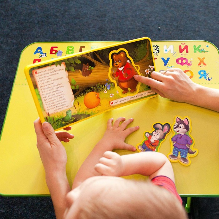 С мягкой книгой малыш сможет оживить героев сказки и воспроизвести её сюжет, а также — поиграть с вынимающимися пазлами.