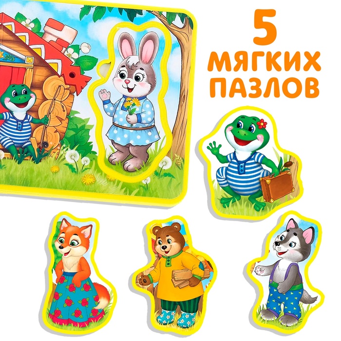 С этим мягким изданием малыш сможет оживить героев сказки «Теремок». Внутри книги есть пять вынимающихся пазлов со зверушками.