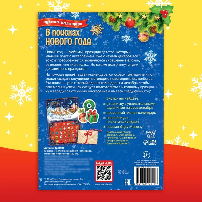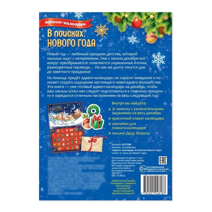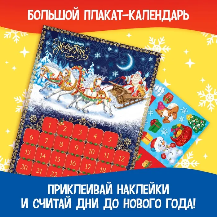 В течение всего декабря малыш будет выполнять задания и отмечать даты в календаре с помощью наклеек. Ребёнок напишет письмо Деду Морозу, раскрасит картинки, расшифрует слова, преодолеет лабиринты и даже слепит снеговика из ваты.