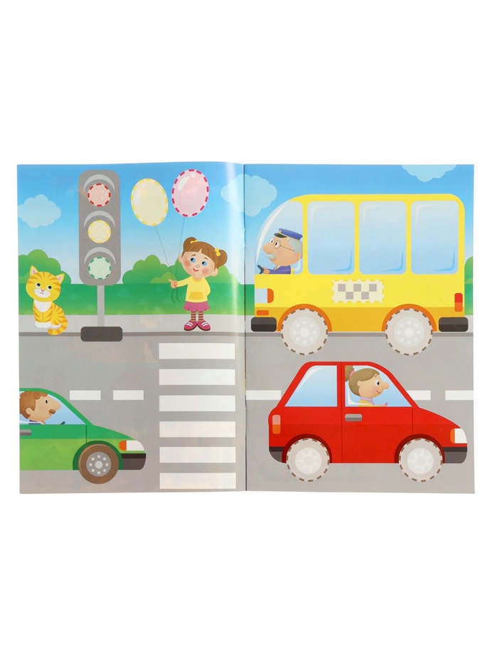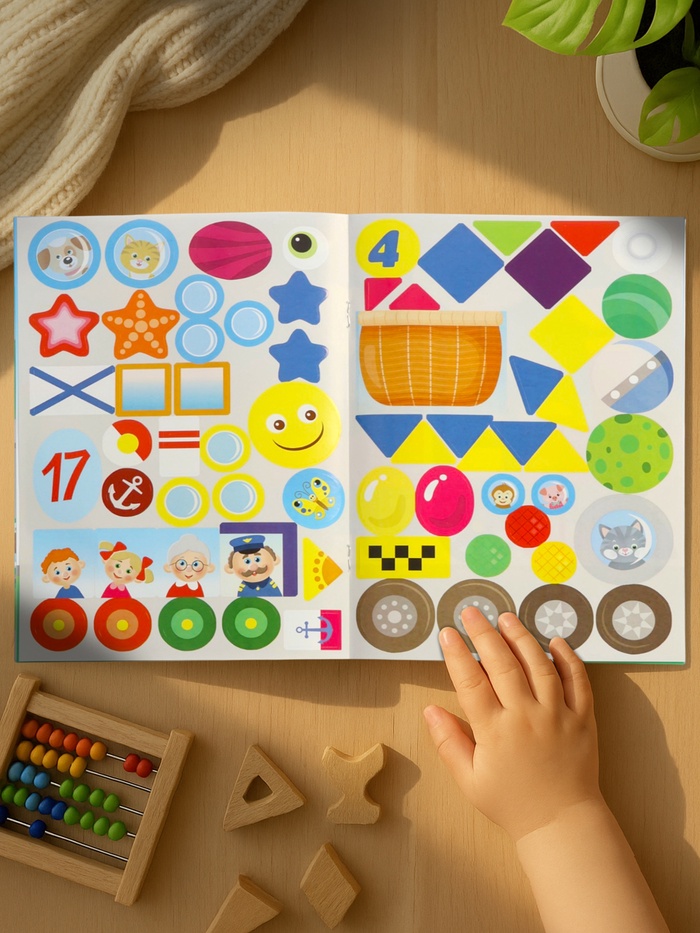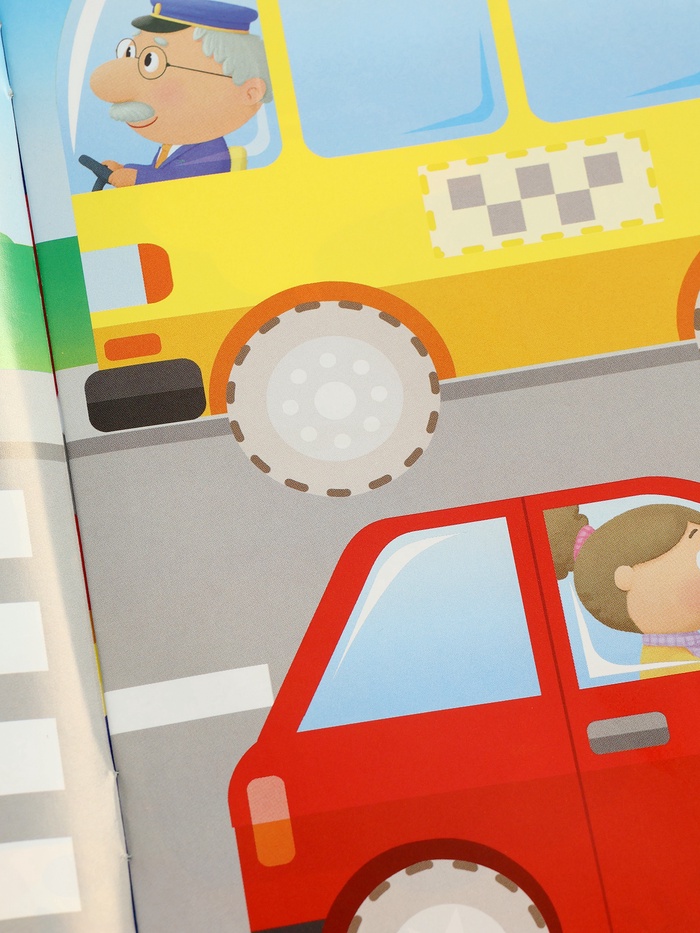 Ребёнок не читает — он разбирается в транспорте. На каждой странице — своя среда: дорога, небо, море. Никакого текста, только картинки и наклейки. Это не занятие, а игра, в которой малыш сам учится классифицировать, наблюдать и принимать решения.