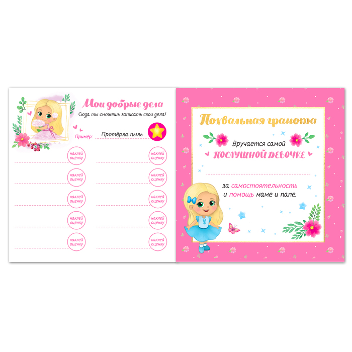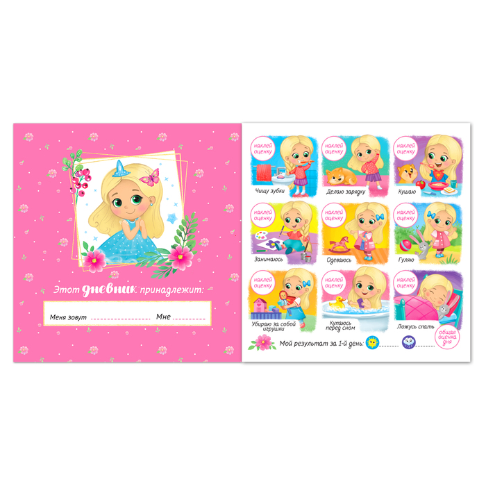 Дневник поможет родителям в воспитании маленькой принцессы и развитии у неё самостоятельности и ответственности. Он рассчитан на неделю, в течение которой вы должны следить за выполнением распорядка дня и приклеивать наклейки-оценки. Полезно договориться с ребёнком о каком-то призе, который он получит в конце недели в случае, если в его дневнике будет больше солнышек, а не тучек. Поверьте, это работает!