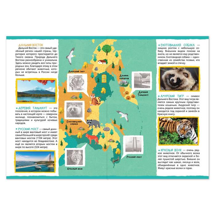 В этой книге малыш познакомится с животными нашей страны и интересными достопримечательностями. Яркие картинки тренируют визуальное восприятие малыша, память и воображение.