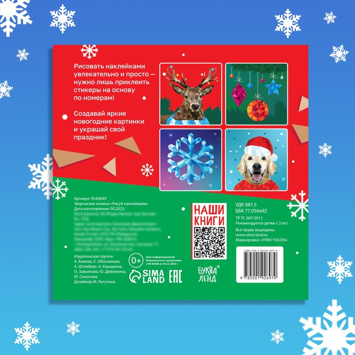 Творческая книга «Рисуй наклейками» поможет организовать досуг для малыша в предпраздничное время. С этой книгой кроха создаст целые 4 картинки в новогодней тематике.