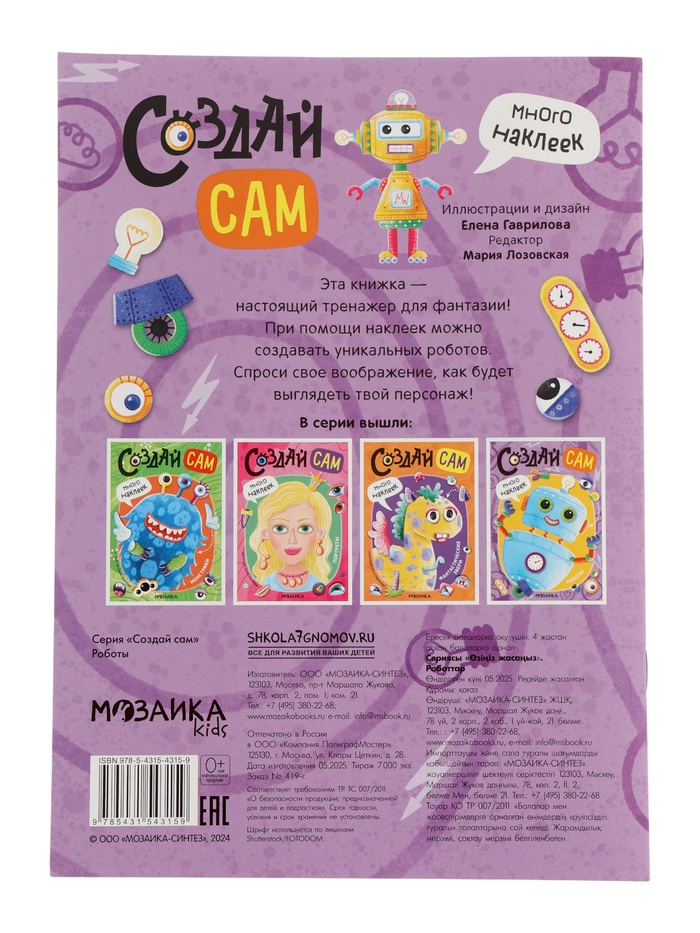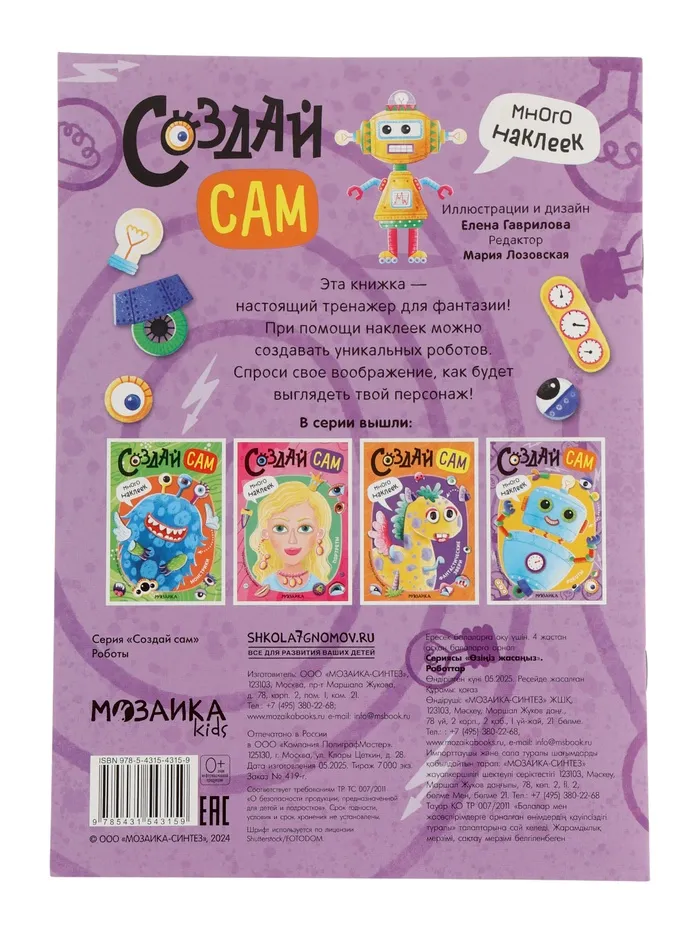 «Создай роботов» станет отличным подарком для маленьких любителей техники и фантастики. Она идеально подойдёт для домашних занятий, путешествий или как часть праздничного досуга. Эта книга не только развлекает, но и учит ребёнка быть внимательным, терпеливым и креативным. Позвольте малышу почувствовать себя настоящим создателем удивительных механизмов!