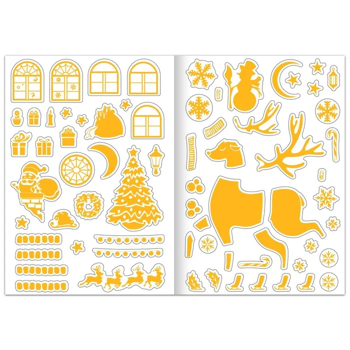 - Внутри ребёнок найдёт 4 заготовки для аппликаций, 4 странички со светящимися наклейками и примеры, что должно получиться в итоге.