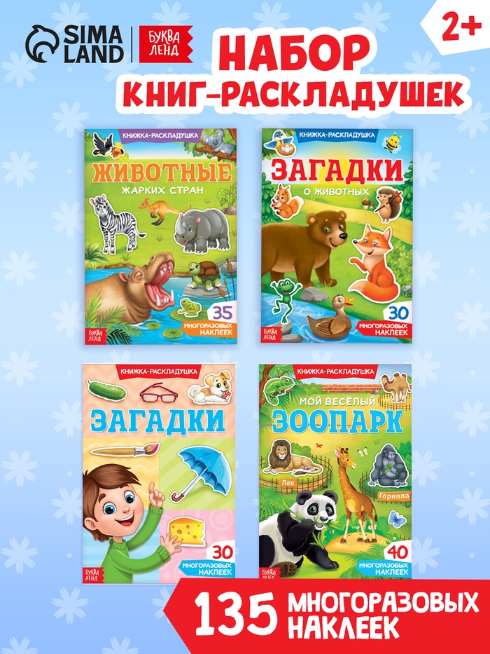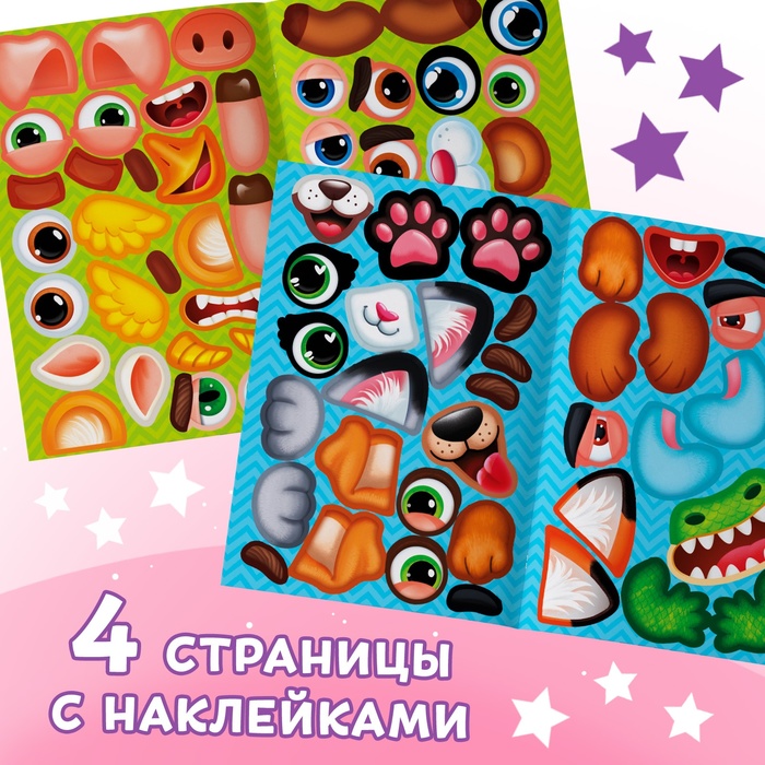 - Внутри есть 10 основ в виде разных животных и 2 листа наклеек с частями мордочек и лапками.