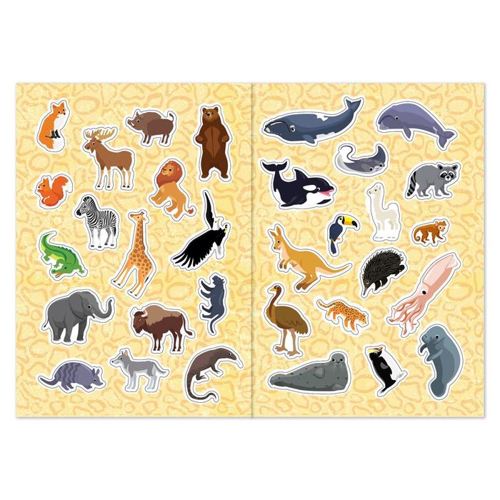 На каждом развороте есть задания, где необходимо приклеить картинки с соответствующими животными. Упражнения развивают мелкую моторику, внимание, речь и расширяют кругозор.