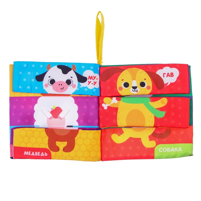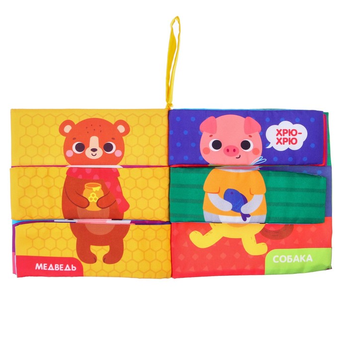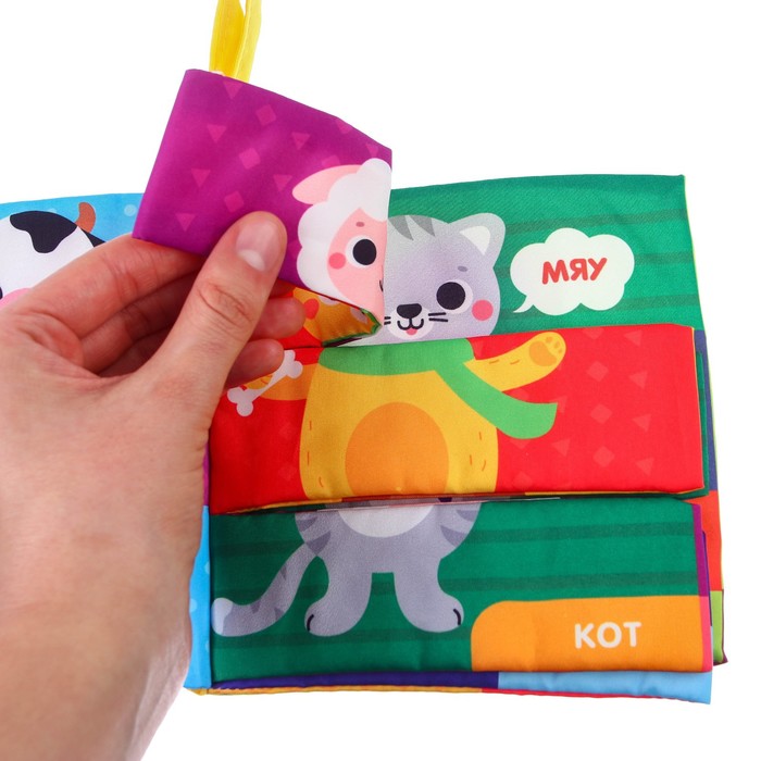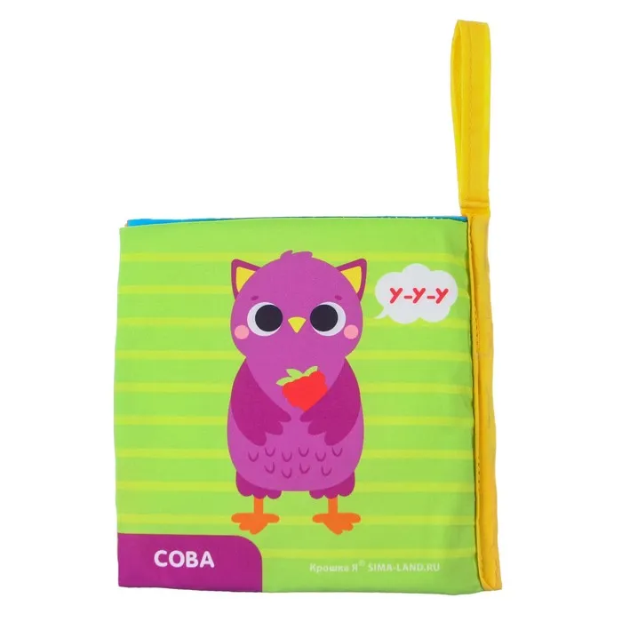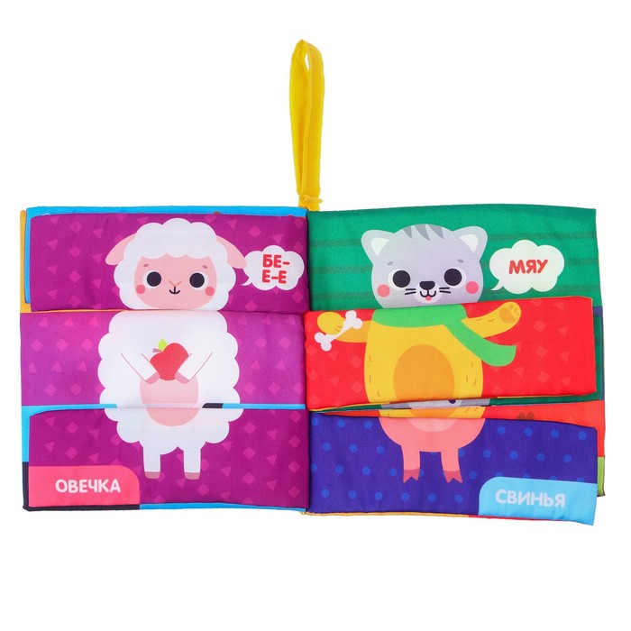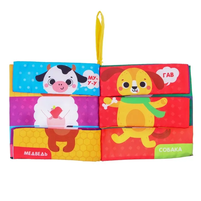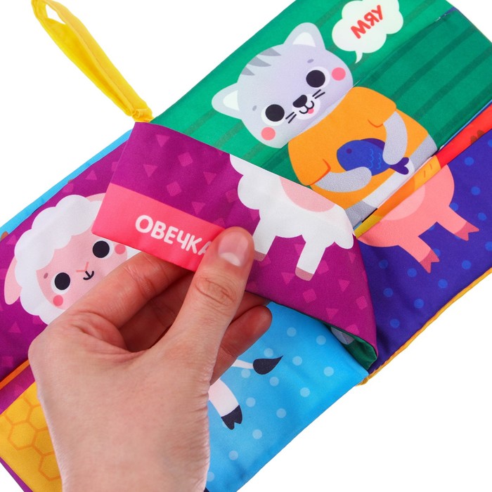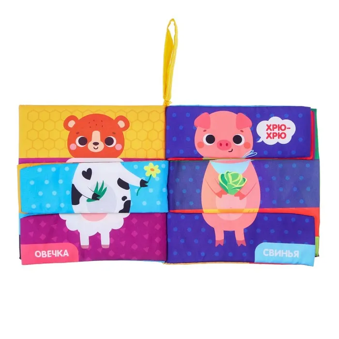- Книжка выполнена из мягкого текстиля с шуршащими элементами для тактильного и звукового развлечения.